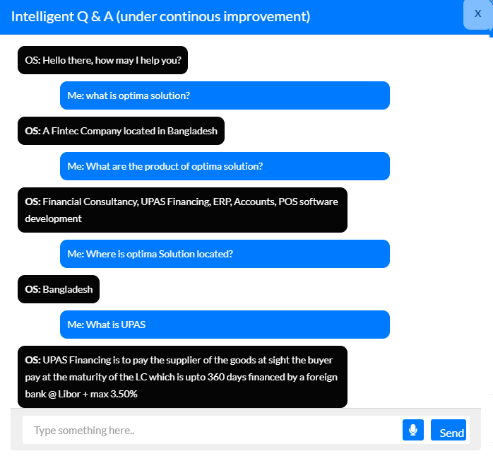 Optima Solution has integrated NLP Chatbot with Artficial Intelligence. A Neural Network has been designed and implemented to pluck answer the question from existing information in a way to reflect human behavior. Speed and simplicity have also been imphesized to enhance the performanc. A screenshot of the artificial intelligent chatbot is given below: